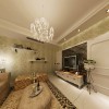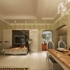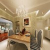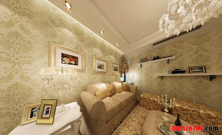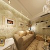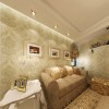 在客厅的电视背景墙上铺贴了浅绿色的花纹的墙纸,在电视背景墙的上面还采用石膏板装饰出非常简约的线条结构。在电视背景墙的正上方的位置安装的射灯的光线打在墙面上,色彩的对比更加的多姿多彩。客厅中央位置一盏漂亮的水晶灯,让人想起大森林中的精灵,给人非常唯美的感受。