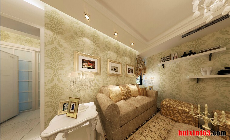 在客厅的电视背景墙上铺贴了浅绿色的花纹的墙纸,在电视背景墙的上面还采用石膏板装饰出非常简约的线条结构。在电视背景墙的正上方的位置安装的射灯的光线打在墙面上,色彩的对比更加的多姿多彩。客厅中央位置一盏漂亮的水晶灯,让人想起大森林中的精灵,给人非常唯美的感受。