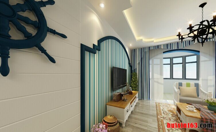 本案例是一套150平米的四居室装修,采用的是地中海风格的装修风格,在整个空间的布置当中,并没有采用大量的元素来堆砌,局部通过色彩适当的点缀,演绎出来的效果更加的生动形象并且突出,在客厅的设计当中,平顶式的石膏板吊顶,背景色彩以白色为主,个性的边角处理,搭配上一盏黑色的铁艺吊灯,营造出一种黑白搭配的经典造型,反观电视背景墙的设计,蓝白色的条纹壁纸铺贴,在视觉效果上给人一种动态的美感,实木铺设的地板,搭配上一张黄色的地毯,唯美的花纹让空间展现出一种浪漫、温馨的氛围,工艺别致的窗帘,以及沙发背景墙壁画的悬挂,将地中海风格的特征展现得淋漓尽致。