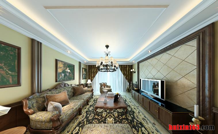 墙砖贴饰而成菱形格子造型电视背景墙,实木边框装饰,简约中透着高雅,实木电视柜,浅金色线条勾边设计,不仅让电视柜更显立体,也增加了电视柜的华贵之感。整个背景墙设计,富有浓重的历史厚重感与古典感。简约大方的凹位造型吊顶设计,不仅美观,视觉舒适度高,且经济实用,与电视背景墙浓重的深色形成鲜明对比,层次分明,不会给人头重脚轻之感。铁艺吊灯悬挂在客厅吊顶上,带着美式家居的气息,与吊顶风格不同却并不显的突兀。四周灯带及射灯搭配,使得家居更显明亮。浅米黄墙漆粉饰沙发背景墙,实木框将背景墙均等分隔,突显立体感,美式画风装饰画点缀,为家居增添了浓郁的艺术气息。体态宽大,质地厚重的沙发,实木结构框架,适当雕花以增加了沙发的美感,布艺花纹靠背及坐垫设计,蓬鼓柔软的靠枕装饰,给人端庄气派、舒适典雅之感。大理石拼花地板设计,令地面更具变化,更显丰富。