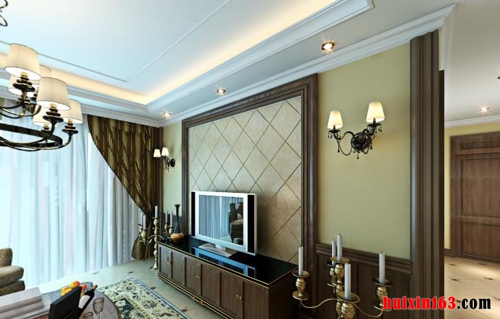 墙砖贴饰而成菱形格子造型电视背景墙,实木边框装饰,简约中透着高雅,实木电视柜,浅金色线条勾边设计,不仅让电视柜更显立体,也增加了电视柜的华贵之感。整个背景墙设计,富有浓重的历史厚重感与古典感。简约大方的凹位造型吊顶设计,不仅美观,视觉舒适度高,且经济实用,与电视背景墙浓重的深色形成鲜明对比,层次分明,不会给人头重脚轻之感。铁艺吊灯悬挂在客厅吊顶上,带着美式家居的气息,与吊顶风格不同却并不显的突兀。四周灯带及射灯搭配,使得家居更显明亮。浅米黄墙漆粉饰沙发背景墙,实木框将背景墙均等分隔,突显立体感,美式画风装饰画点缀,为家居增添了浓郁的艺术气息。体态宽大,质地厚重的沙发,实木结构框架,适当雕花以增加了沙发的美感,布艺花纹靠背及坐垫设计,蓬鼓柔软的靠枕装饰,给人端庄气派、舒适典雅之感。大理石拼花地板设计,令地面更具变化,更显丰富。