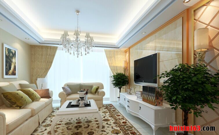 本套房屋装饰的色彩主要是以暖色调为主,客厅中的石膏板吊顶装饰可以带给人们一种非常大气的感觉,四周的加层处安装了一圈白色的灯带,白色的灯光可以将中间的水晶吊灯衬托的飞航藏华美、精致,宽大的落地窗前悬挂了双层窗帘,一层白色的轻质薄纱可以将室外较强的日光变的温和一些,也可以使房间显得更加温馨,电视背景墙则使用了淡黄色的墙面砖进行装饰,整体效果显得非常大气,电视下方是一款白色的小矮柜,小巧的体积加上精致的做工使其显得更加高档,在搭配上暖黄色的背景,显的更加唯美。